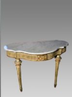 Elegante consola neoclásica en madera tallada, lacada y dorada. Soportes con estrangulaciones y acanaladuras. Tablero de mármol coetáneo, de forma contorneada. 81 x 100 x 49 cm